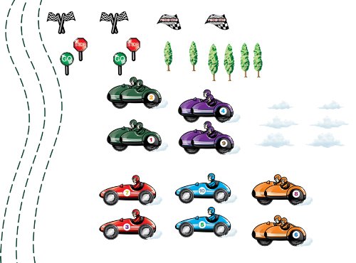 - What's included: 10 multi-colored race cars, 84 roadway lines, 6 clouds, 6 trees, 4 flags, 6 signs