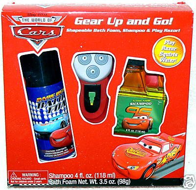 1 Bottle of Cars "Action Apple" Shampoo (shaped like a gasoline can) - 4 fl. oz. 1 Bottle of Cars "Race Ready" Shapeable Bath Foam - 3.5 oz. Berry-Scented 1 Play Razor - Squirts Water!