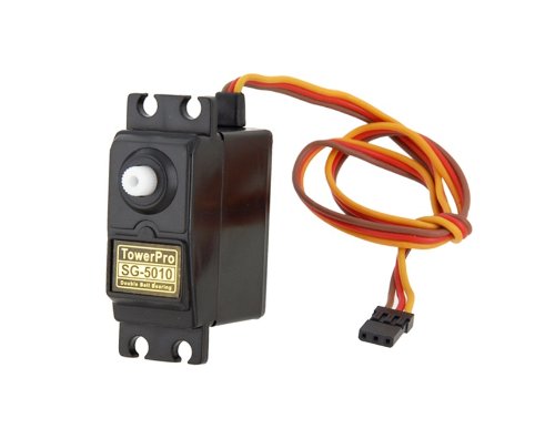 Made up of coreless motor, metal gear, double ball bearing and connector wire.Operation speed: 0.17 sec/60 degree (4.8V); 0.4 sec/60 degree (6.0V).Dead band width: 20us. Great for biped robots, R/C cars, planes and helicopters.Power Supply via an external adapter (not included). Comes with servo arms and screws for easy installation.Temperature range: 0C~55C.Working voltage: 4.8V-6V.Stall torque: 3.1kg/cm (4.8V), 4.5kg/cm (6.0V).Size: 40.2*20.2*43.2mm.Weight: 38g. Package Details Weight: 54.57 g Size: 12*8*2 cm Package Includes 1 ? TowerPro SG5010 Servo1 ? Set of Accessories
